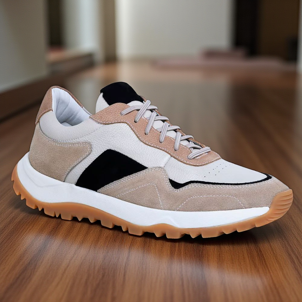 Produzido em uma combinação de couro, camurça e tecido de alta resistência, o design mistura tons neutros de bege e off-white com detalhes em preto, criando um visual moderno e versátil.